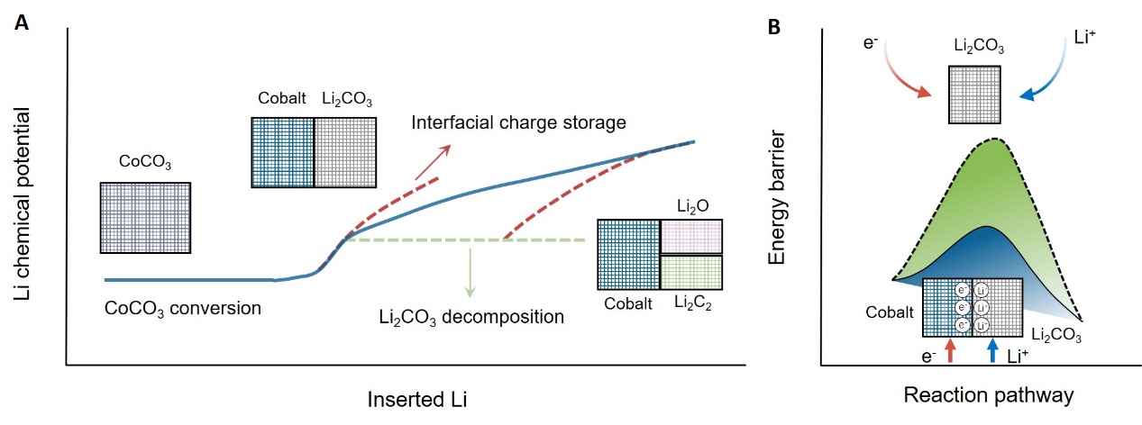 过渡金属和相关化合物由于其有趣的电子结构而在各种电化学反应中表现出高催化活性。鲜为人知的是,它们在电池电极中存储和转移电子方面的独特作用,电池电极经历额外的固态转化反应,并表现出相当大的额外容量。在这项工作中,研究人员在CoCO3/Li电池模型中揭示了在金属纳米颗粒存在下电化学界面的产生和演变的完整动态图像。除了在电池放电过程中传统地还原为Li2CO3/Co混合物之外,Li2CO3的进一步分解是通过从其相邻的Co纳米颗粒释放界面间存储的电子来实现的。这项工作的发现不仅可以启发下一代储能器件先进电极材料的发展,而且为揭示许多能量转换和存储系统中重要电催化机制提供了解决方案。