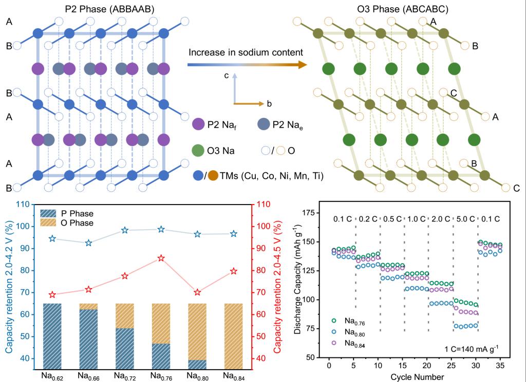 在众多钠离子正极材料体系中,层状过渡金属氧化物NaxTMO2具备高电化学性能且易于合成,得到了研究者们广泛的关注。与单相NaxTMO2材料相比,构建多相NaxTMO2正极材料能够通过激发不同相结构之间的协同作用有效稳定材料的结构,降低材料相变的程度,从而提升材料的电化学性能。但由于多相材料其固有的结构复杂性,缺乏对相组成变化和高电压下循环结构稳定性之间的深度理解,需要进一步探索并了解多相协同作用的内在机理。在本工作中,研究人员制备了一系列用于钠离子电池的双相层状氧化物NaxCu0.1Co0.1Ni0.25Mn0.4Ti0.15O2正极材料,通过物相表征、电化学测试、原位电化学表征和理论计算揭示了不同比例的双相结构对于材料高电压下结构稳定性的影响。与以往研究不同,该工作证实不恰当的双相结构可能比单相设计更具破坏性,合理的P2相和O3相比例对于维持材料结构稳定性和抑制不可逆相变至关重要。特别是,所研究的Na0.76Cu0.1Co0.1Ni0.25Mn0.4Ti0.15O2正极材料,其P2:O3=4:6的相比例在高电压和深度脱钠状态下表现出了优异的循环稳定性和电化学性能。此外,研究还发现在充电补偿过程中,阴离子氧化还原反应先于镍的氧化还原反应发生。通过结合实验和理论计算,该文章为开发具有先进性能的钠离子电池正极材料提供了新的见解和策略。