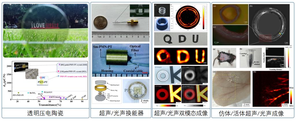 光声成像是利用脉冲激光激发生物组织产生超声信号来成像的一种新兴无损检测技术,它结合了光学成像的高对比度和超声成像的高穿透深度的优点,可得到高分辨率和高对比度的组织图像。由于光源和超声探测器的多参量可调,光声成像可实现从细胞到生物器官的多尺度成像,在癌症早期筛查、血管内斑块检测、浅表微血流成像等领域展示巨大的应用潜力。超声换能器作为光声成像的关键核心器件,其透明化不仅利于光声共轴、提高光声成像分辨率和灵敏度,还可以大大减小器件尺寸,利于其在内窥镜探头等微型器件中的应用。然而,铁电畴壁及晶粒晶界处的光散射使得制备兼具高压电性和高透明度的陶瓷材料非常困难,制约了高性能透明光声换能器的设计及其在光声成像中的应用。