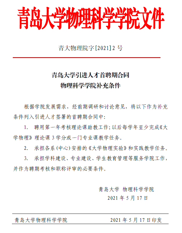 青岛大学引进人才首聘期合同注册送彩金 补充条件