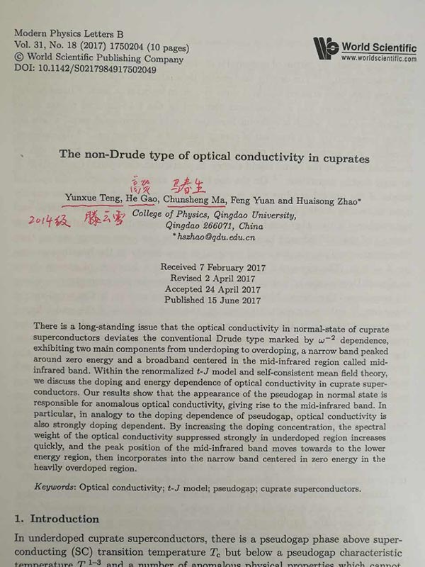 本科生从创新实验中取得的成果傲人。其中最吸人眼球的是2014级新能源科学与工程专业的滕云雪同学,以第一作者身份在期刊《Modern Physics Letters B》(Vol.31,No.18,2017)上发表一篇题为《The non-Drude type of optical conductivity in cuprates》的SCI论文。其指导教授为物理系的赵怀松博士,论文参与作者还有2014级新能源科学与工程专业的高贺、马春生。除此之外,取得的成果还有省级学科竞赛一等奖5项,二等奖7项,三等奖3项;本科生参与的国家发明专利授权3项。