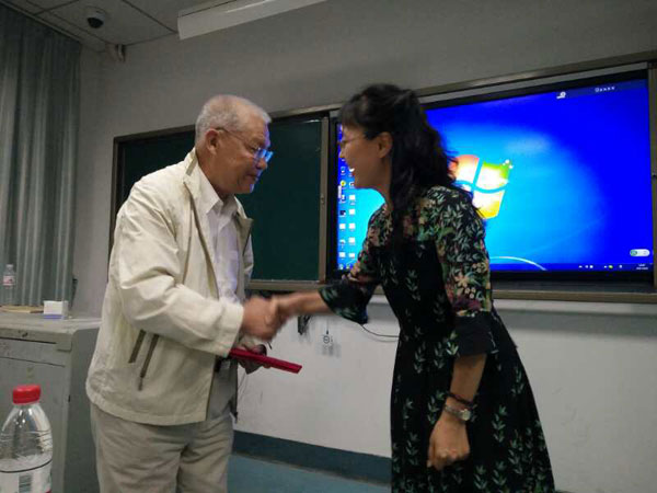 会上,滕冰向陈祖骥颁发了科普顾问证书,聘请他为学院科普活动指导教师。陈祖骥老师向同学们讲述了科普的重要性,演唱了由自己编词的歌曲《电磁波》。