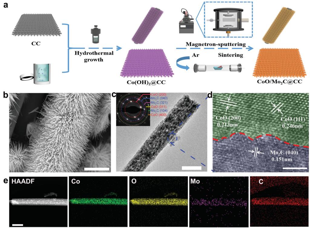 功函数诱导内建场驱动的异质结构空间电荷转移可以调节催化剂的电子结构以提高催化活性。该论文采取了一种新的自上而下的策略构建外延异质结催化剂CoO/Mo2C,其界面电子再分配诱导的功函数用于降低HER和OER过电位,提高整体水分解。理论模拟和实验结果表明,功函数诱导的内建场通过在CoO/Mo2C界面形成的“Co─C─Mo”键促进了电子从CoO向Mo2C的转移,实现了界面电子的重新分布,进一步优化了原始反应步骤的吉布斯自由能,从而加速了析氢反应HER动力学。正如预期的那样,具有界面效应的CoO/Mo2C表现出优异的析氢反应HER催化活性,仅需要107 mV的过电位即可达到10 mA cm−2,并且连续稳定催化60小时。此外,组装的CoO/Mo2C表现出优异的整体水分解性能(10 mA cm−2条件下HER和OER的过电位分别为107和250 mV,水的实际分解电压为1.58V)。这一工作为基于内电场引起的界面效应设计材料提供了一种新的可能性,并可应用于其它领域。