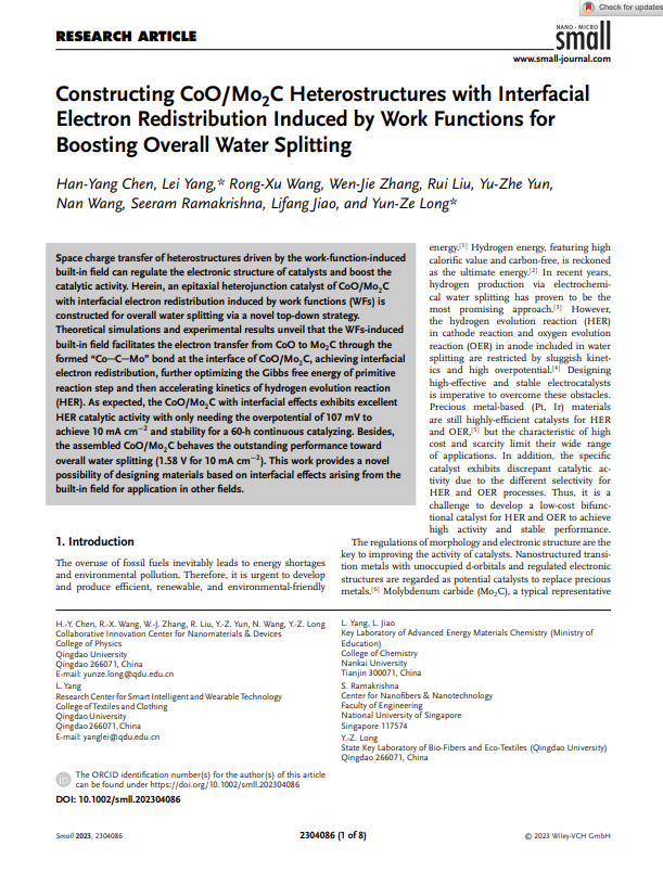 新能源科学与工程专业2020级本科生陈汉阳在中科院1区TOP期刊Small(影响因子13.3)以第一作者身份发表了题为“Constructing CoO/Mo2C Heterostructures with Interfacial Electron Redistribution Induced by Work Functions for Boosting Overall Water Splitting(构建由功函数诱导界面电子再分布的氧化钴/碳化钼异质结构促进整体水分解)”的研究论文(Small, 2023, 2304086)。纺织服装学院杨磊副教授与注册送彩金