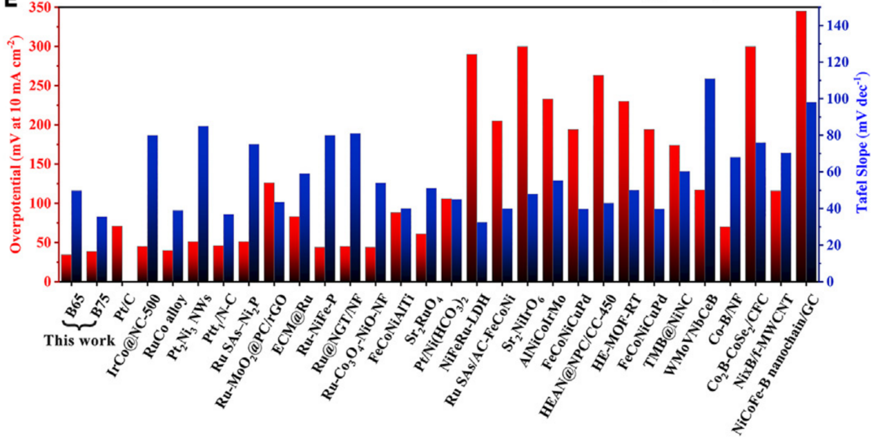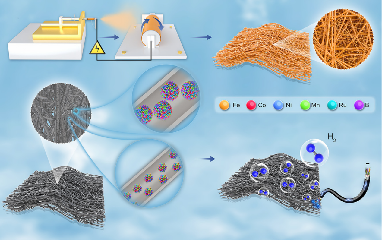 为了满足现代社会的能源需求,寻求可持续、清洁和高效率的能源生产尤为重要。电解水是一种高效的可持续氢生成途径,被认为是未来可再生能源生产、储存和使用的有效方法。电解水由两个半反应组成,分别是阴极析氢HER和阳极析氧OER。由于存在HER和OER过电位,水的实际分解电压远高于理论分解电压1.23 V。高效催化剂的设计和合成是提高水电解制氢能效的关键。在各种电催化剂中,高熵合金以其独特的性能和优异的析氢反应HER催化活性而备受关注。然而,小尺寸高熵合金催化剂的精确合成仍然具有挑战性,这限制了其催化性能的进一步提高。受树枝发芽和生长的启发,刘进华等采用静电纺丝技术成功制备了具有原位生长树突结构的硼和氮元素掺杂高熵合金多孔碳纳米纤维。此外,树突纤维抑制了高熵合金粒子的生长,从而合成了量子点尺寸(1.67 nm)的高熵合金粒子。在1摩尔KOH、10 mA/cm2电流密度下,树枝状硼和氮元素掺杂高熵合金多孔碳纳米纤维能够达到34.4~38.5 mV的最低过电位和35.45 mV/dec的低塔菲尔斜率。具有多孔表面的氮元素掺杂碳纳米纤维能够提高催化剂的导电性,加快电子和物质的传输,并避免高熵合金纳米粒子的团聚。硼元素的引入使得纤维分化发芽形成树枝状结构。树枝状结构能够分化出更多的接触位点,碳纤维和高熵合金结合可以加速电子和离子的传输,从而降低动力学反应势垒,用硼元素掺杂可以调节电子构型并优化催化剂表面上的热力学氢吸附/脱附,这是提高电催化效率的原因。该工作对其他元素组合的硼化高熵合金纤维的制备以及开发探索树枝状纳米纤维在电化学领域的应用提供了新的设计思路。