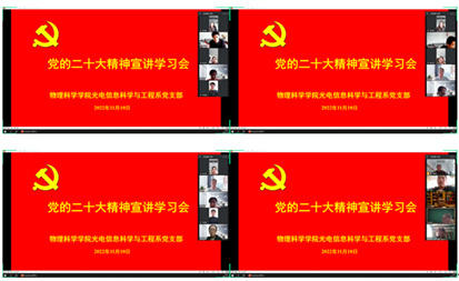 各党支部也纷纷以不同形式开展了党的二十大精神学习活动。应用物理系党支部召开二十大精神专题学习会。所有党员重温入党誓词,学习党的二十大报告和党章修正案,部分党员从高校教师职业角度出发分享了学习二十大精神的感悟。