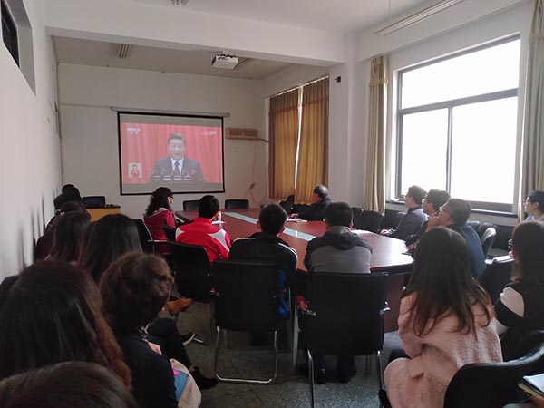 10月18日上午,注册送彩金 在博逸楼401会议室统一收看了党的十九大开幕式实况。学院党政领导黄国俊、滕冰、周志强、王乙潜,各系(中心)主任和副主任、各支部书记和副书记、机关全体工作人员、部分教职工以及学生党员代表等40余人参加了收看活动。