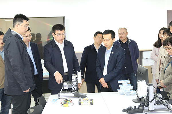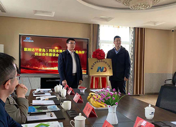 李升学带领学院师生首先参观了院士港14号楼研学基地,随后与聚纳达(青岛)科技有限公司总经理于淼、副总经理钟金涛等进行了座谈,洽谈了双方在学生培养、创新创业项目等方面的合作事宜。会上,李升学和于淼为学院实习基地进行了揭牌。