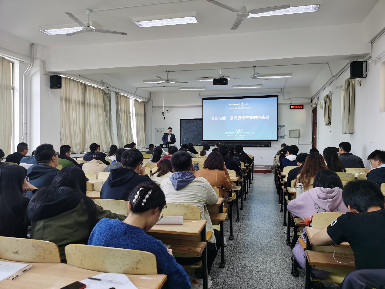 邀请海信集团激光显示公司副总经理,首席科学家刘显荣博士在博学楼302教室为师生作了题为《激光电视:激光显示的排头兵》的学术报告。报告会由院长滕冰主持,师生近100人聆听报告。海信科学探索中心杨雪馆长参加报告会和座谈交流,对进一步加强双方交流合作提出了宝贵建议。