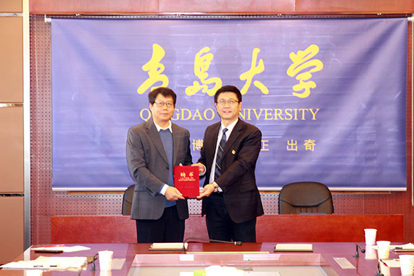 于红波首先向澳大利亚伍伦贡大学超导和电子材料研究所所长王晓临颁发了青岛大学客座教授聘书。他对王晓临在青岛大学办学110周年之际到访表示热烈欢迎,并向客人介绍了青岛大学的办学历史和物理学科的基本情况,强调学校高度重视和坚定支持国际化办学战略,希望双方能强强联合,在人才培养、科学研究、学科建设等方面发挥各自特色优势,开展富有成效的合作。