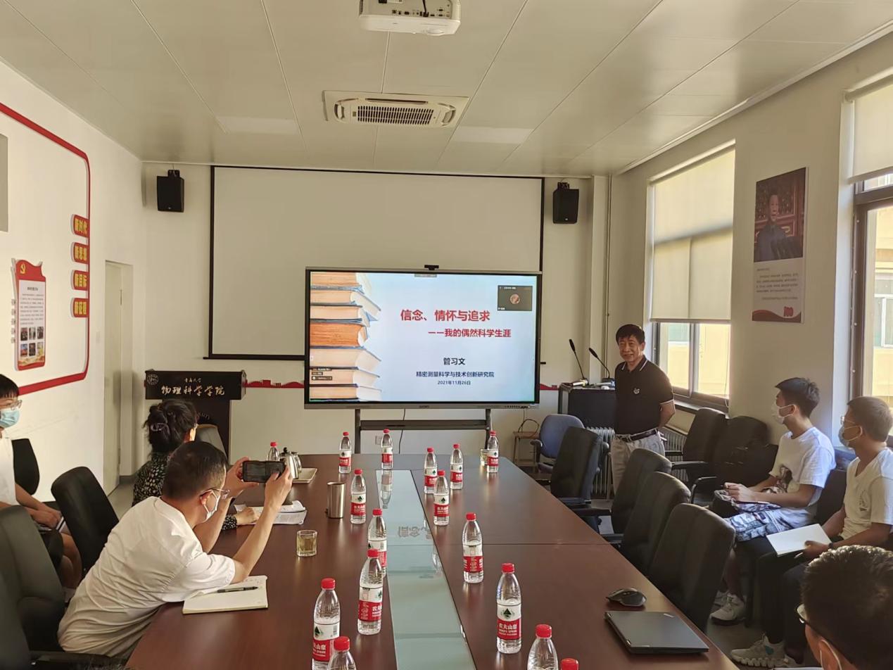 访问,并以线上线下结合的方式为学院师生作了题为《信念、情怀与追求--我的偶然科学生涯》和《Observation of Spin-Charge separation in 1D atomic Fermi gases》的报告。报告由院长滕冰教授主持。院党委书记郝伟及李强教授、张永成副教授等老师和部分本科生和研究生聆听了报告。
