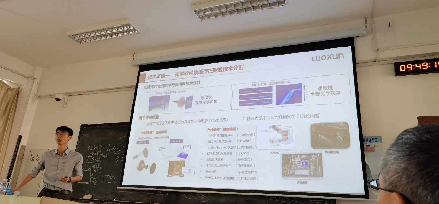 建模与设计已成为光学科技发展中不可或缺的要素。应用场景的多样性对仿真平台提出极高要求,以物理光学为基础搭建仿真平台已成为业内共识。刘智帅深入介绍物理光学建模与设计的突破性概念、光子设计自动化(Photonic Design Automation, PDA)工具的核心策略以及团队的研发产品——基于物理光学的系统级光学CAE软件VirtualLab Unity。该产品以光学软件领域存在明显技术分割为技术驱动,通过求解器联通实现系统级仿真,结合逐点物理光学算法,可实现物理光学对几何光学的向下兼容。该框架平台具有良好的通用性,通过多类型不同精度的求解器集成,可实现逐点/积分运算的无缝切换,可适用于成像、光通信、VR/AR等多种领域的应用。报告最后,刘智帅与全体师生进行了深入交流,结合自身的出国留学及研究经历,为本科生和研究生未来的求学和职业发展规划做了系统分析,并一一解答了老师同学们提出的问题。