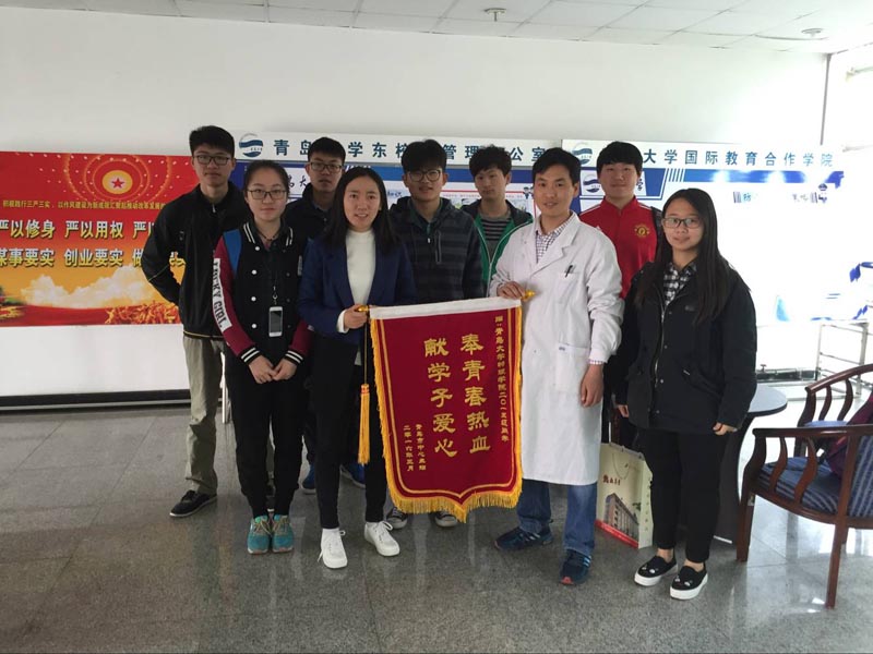 4月1日上午,青岛市中心血站工作人员携带一面写有“奉青春热血,献学子爱心”的锦旗来到注册送彩金 ,感谢物理学院2015级学子对无偿献血的支持。