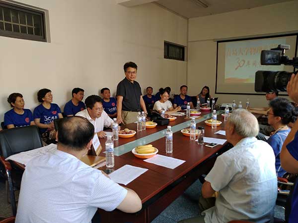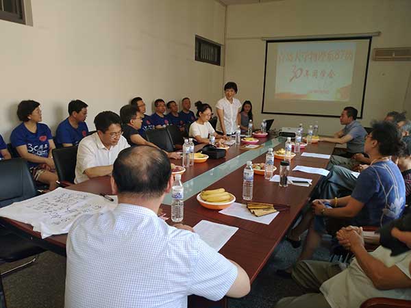 校友办相关负责人发言,介绍了校友办职责、校友会成立情况以及下一步的打算,并欢迎大家回家!会上,老教师和校友们先后发言,回忆当年简单而充实的校园生活,聊得开心,谈得幽默,激情澎湃。校友们洋溢着幸福的笑容,笑容里包含了对恩师、对学院、对学校的深深祝愿。座谈会后,全体校友合影留念,仿佛又回到了30年前。30年前,他们在这里相遇,30年后,他们在这里相聚。在这里,他们度过了人生最美好的四年。
